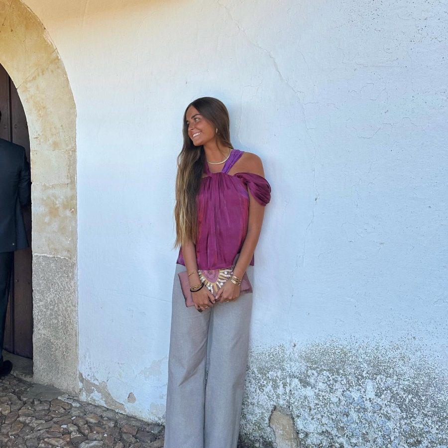 Bandolera con motivos coloridos. Detalle de aros dorados en el asa.
