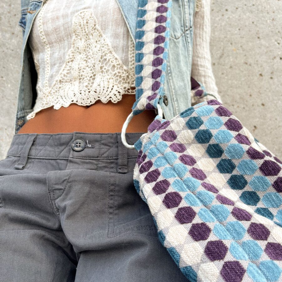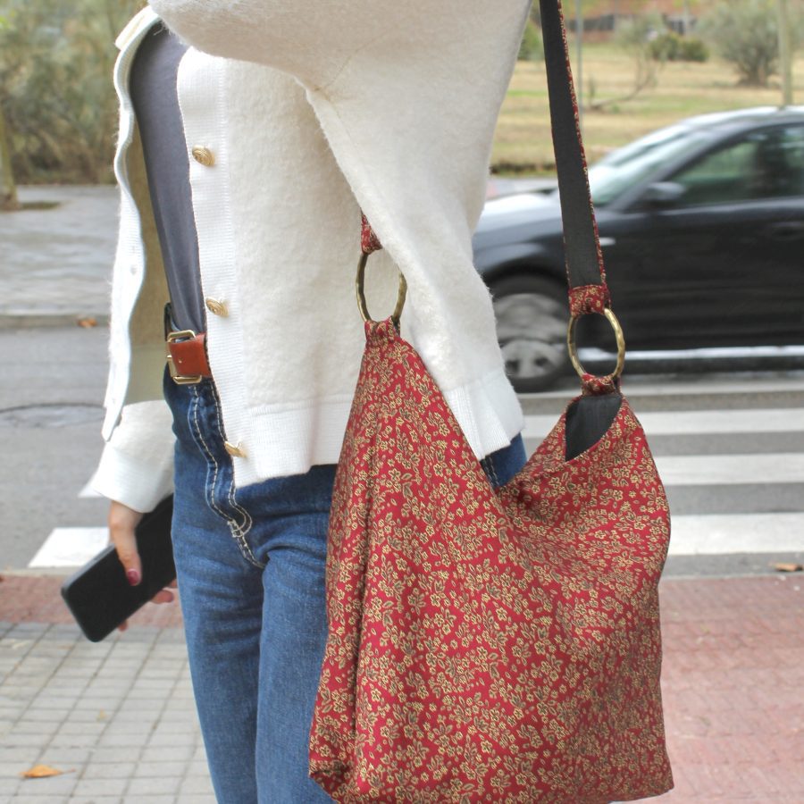 Bandolera mini con motivos coloridos. Detalle de aros plateados en el asa.
